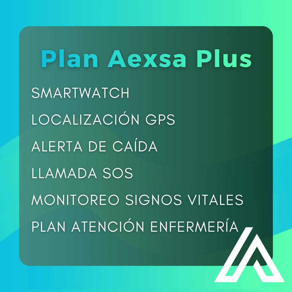 El plan AEXSA PLUS con SmartWatch como parte del plan ofrece una atención completa y moderna, diseñada para la seguridad y el bienestar del usuario. Gracias a la localización GPS, siempre se conoce la ubicación exacta, mientras que la alerta de caída y el botón de llamada SOS permiten reaccionar de manera inmediata ante cualquier emergencia. Además, el dispositivo realiza un monitoreo de signos vitales, facilitando el seguimiento de la salud en tiempo real, y el plan incluye un servicio de atención de enfermería, garantizando acompañamiento profesional y asistencia continua. Así, tecnología y cuidado humano se combinan para brindar tranquilidad y protección diaria.